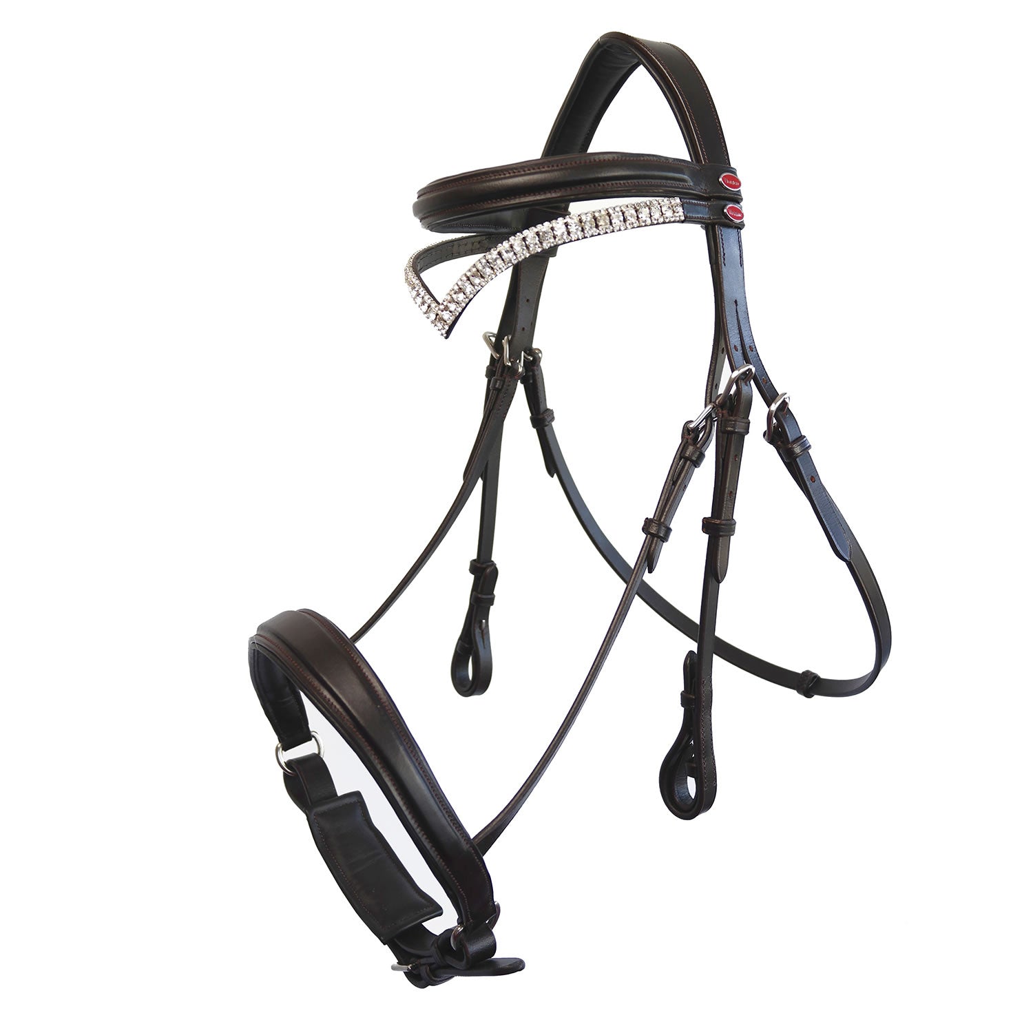 Comes with an everyday raised browband and a bejewelled diamante browband - perfect for shows! Reins sold separately. The supple leather has a natural finish and the browband and noseband are both raised with a tonal stitching throughout.
