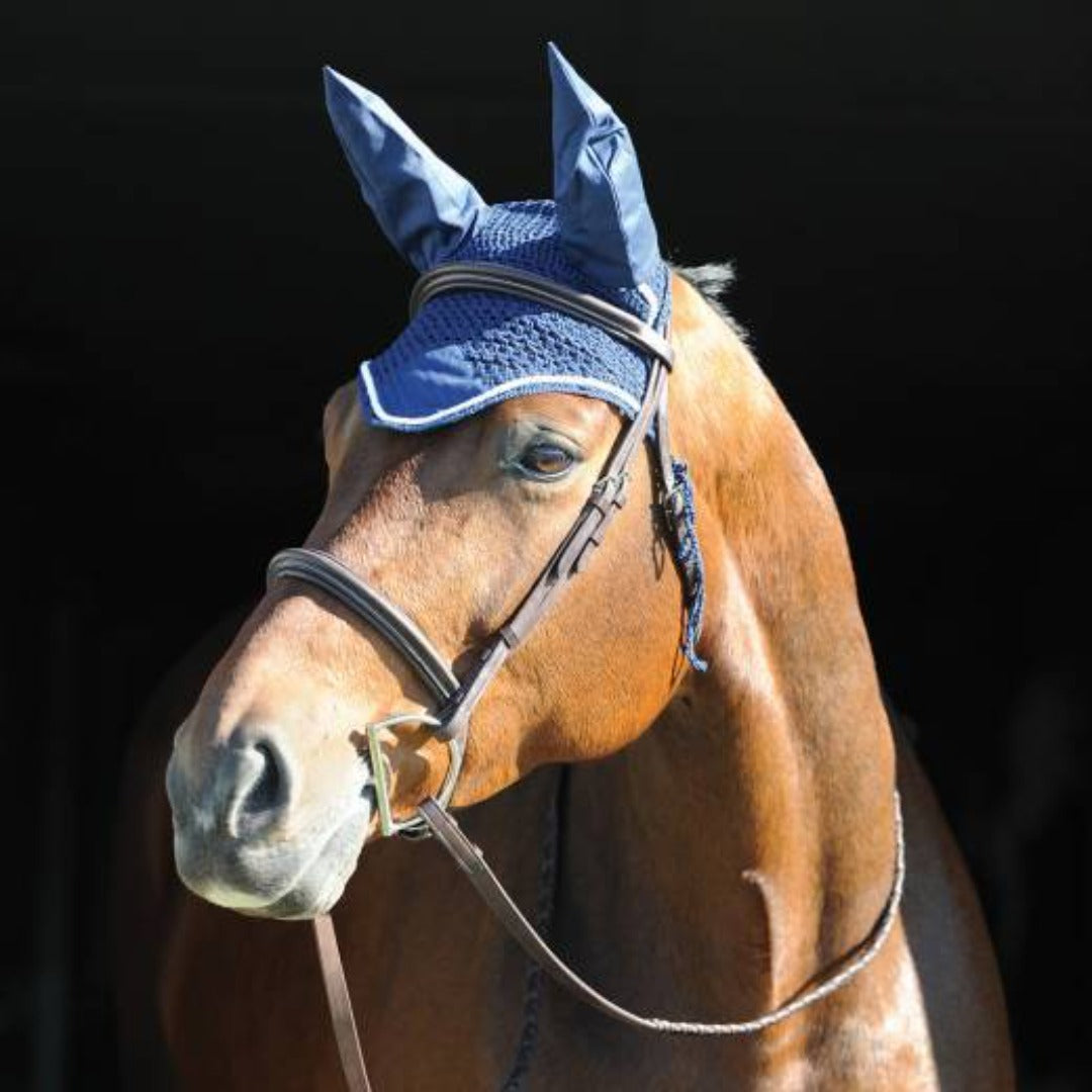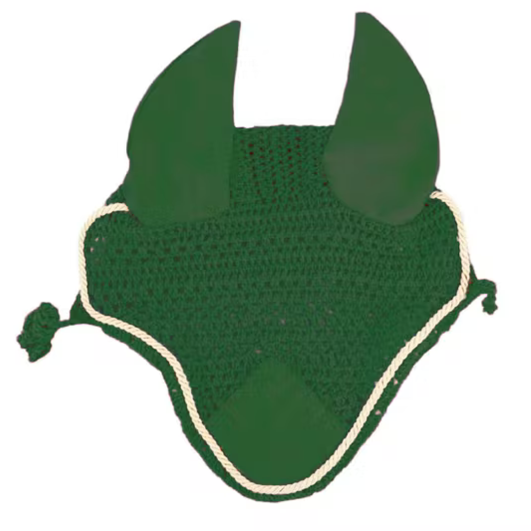 Crocheted ear cover that protects from insects. Can be used whilst riding to help dim sound in a loud environment.