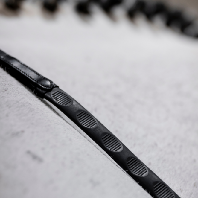 The Horseware® Thumb Grip Rubber Reins are designed to provide the ultimate hold and control. They feature textured indentations ideal for use in dressage to ensure even hand placement and contact, or for strong horses prone to pulling. A tear-resistant nylon core adds strength and durability. Includes tonal stitching, stainless steel hardware, and billet ends.