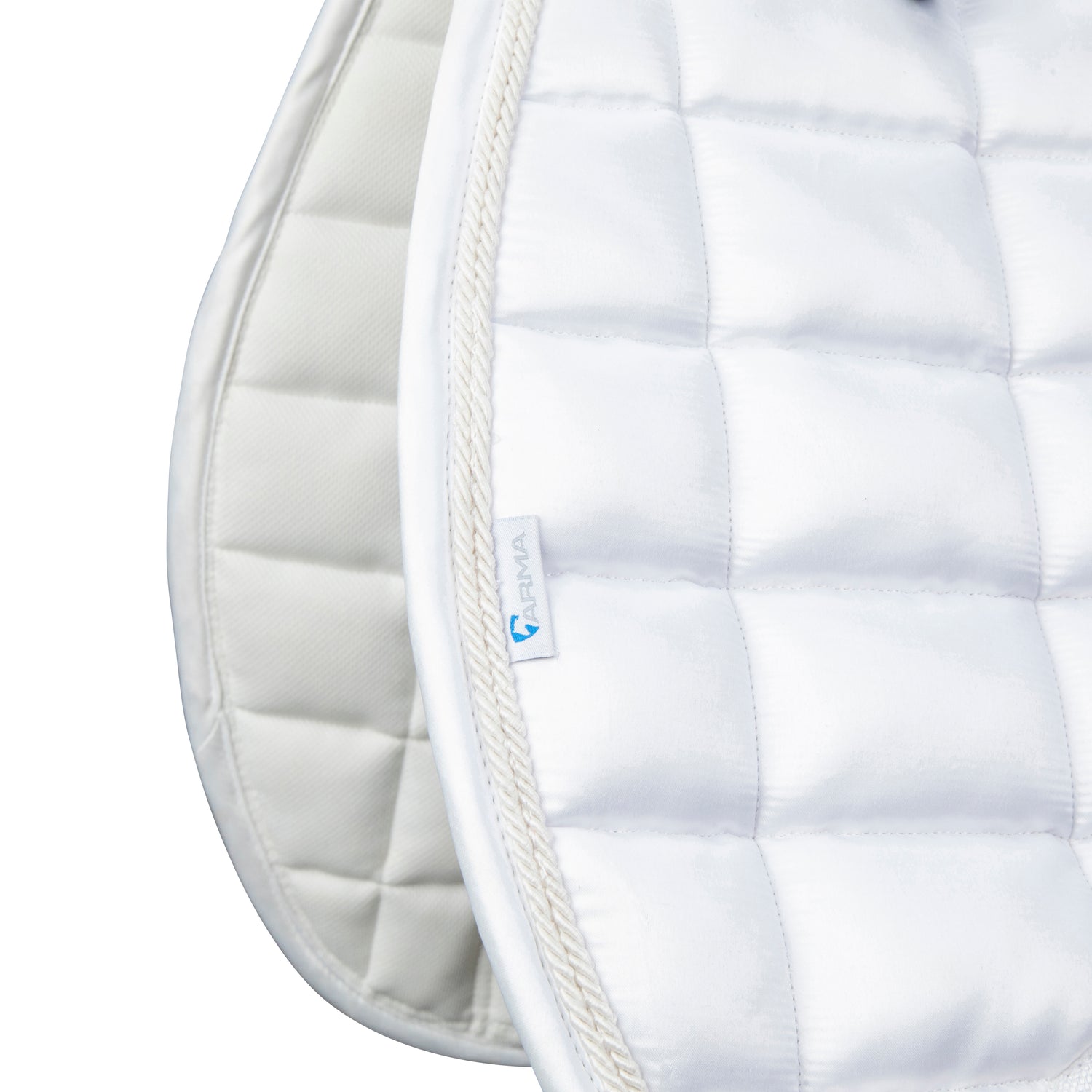 Ultra Dri Zone lining instantly wicks sweat from the horse to reduce the risk of rubbing and increase comfort. PU ARMA contour pro girth guard protects heavy wear areas. Jacquard logo tape looks smart at the spine, girth loops and elasticated D-ring straps. Finished with a metal logo badge. Machine washable. Coordinates with a range of ARMA horse and Aubrion rider pieces.