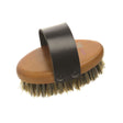 Tan wooden oval body brush with gold/black/beige bristles and a leather strap.