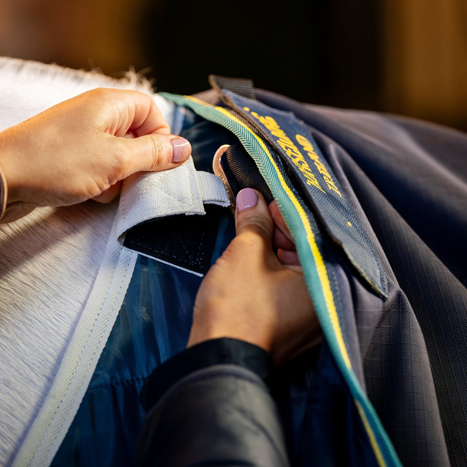 The V-Front Closure & Surefit Neck Design and dual leg arches eliminate pressure around the shoulders and offer extended comfort whilst grazing. The three crossed surcingles incorporate our Rambo® Safety Surcingle System, which can withstand 100kg of pressure, yet will release should your horse become dangerously caught up - extra protection for your horse, extra peace of mind for you.