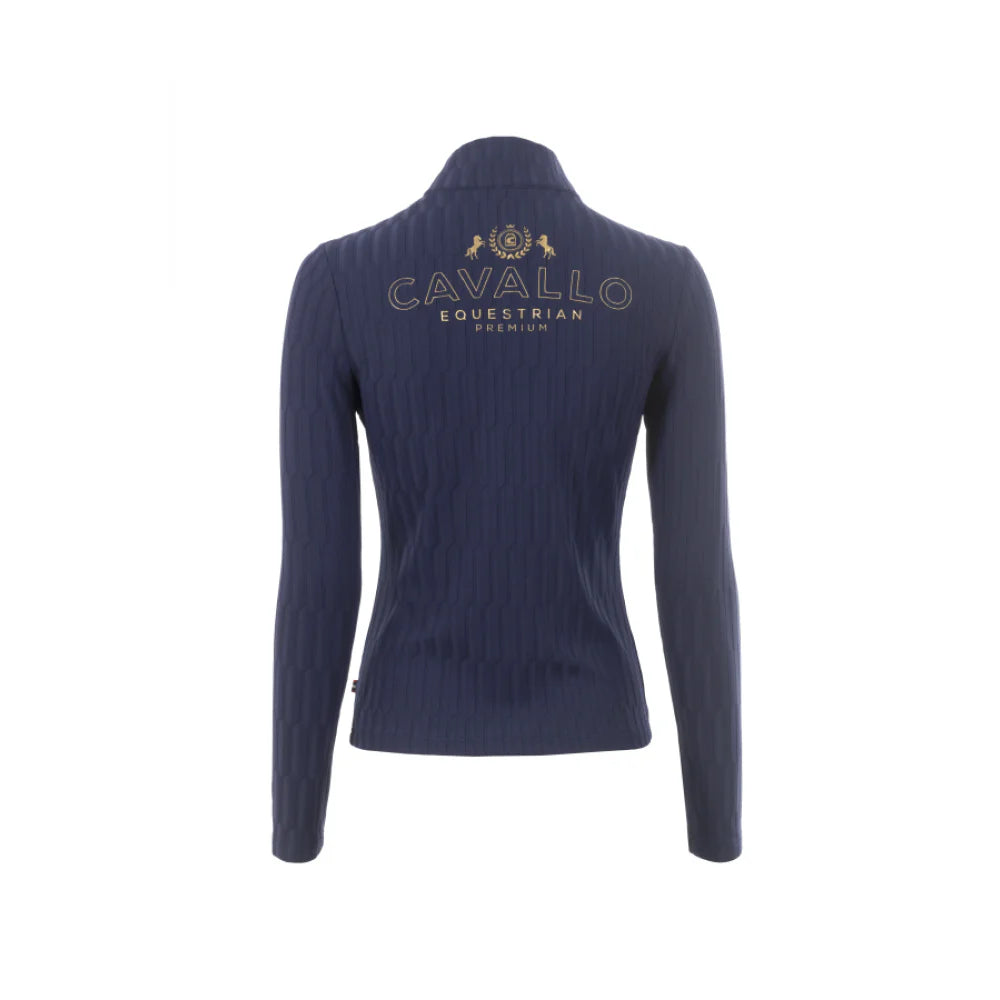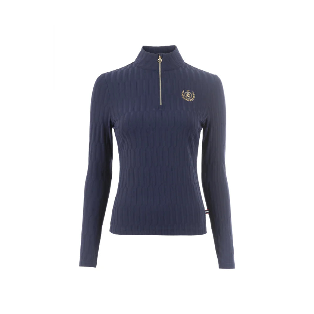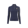 Featuring a soft, functional material and a stand-up collar, the Cavallo Libra Baselayer is a must-have for any equestrian enthusiast. This shirt boasts a short, gold-coloured zipper with a sparkling crystal pendant in the center front, as well as a gold-coloured heraldic logo print with shimmering crystal stones on the left chest. Additionally, two tonal horse embroideries adorn the left side seam at waist height.