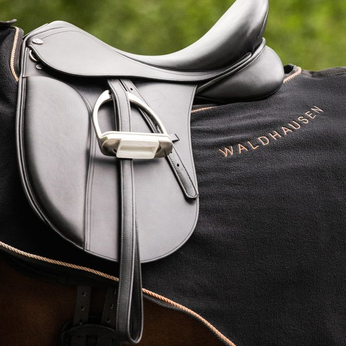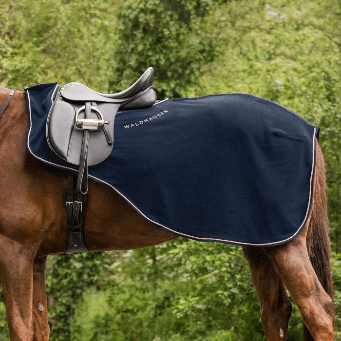 Elegant exercise sheet with quality non-pilling fleece. A rose gold cord, as well as embroidery along the saddle cut-out, ensure an elegant appearance. With a sturdy touch tape fastener at the withers.