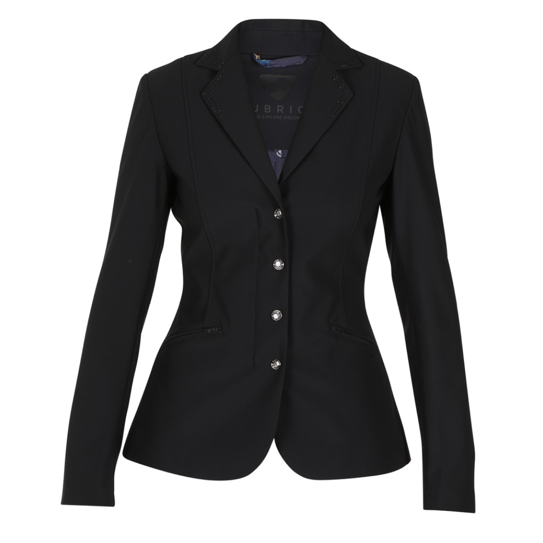 Die Shires Aubrion Ladies Wellington Show Jacket zieht alle Blicke auf sich und hat einen schlanken, konturaktiven Schnitt, der vielen Reitern gefallen wird. Der Kragen ist mit zwei Reihen gleichfarbiger Strasssteine besetzt, vorne in der Mitte und an den Manschetten befinden sich kostenlose glitzernde Emaille-Knöpfe.