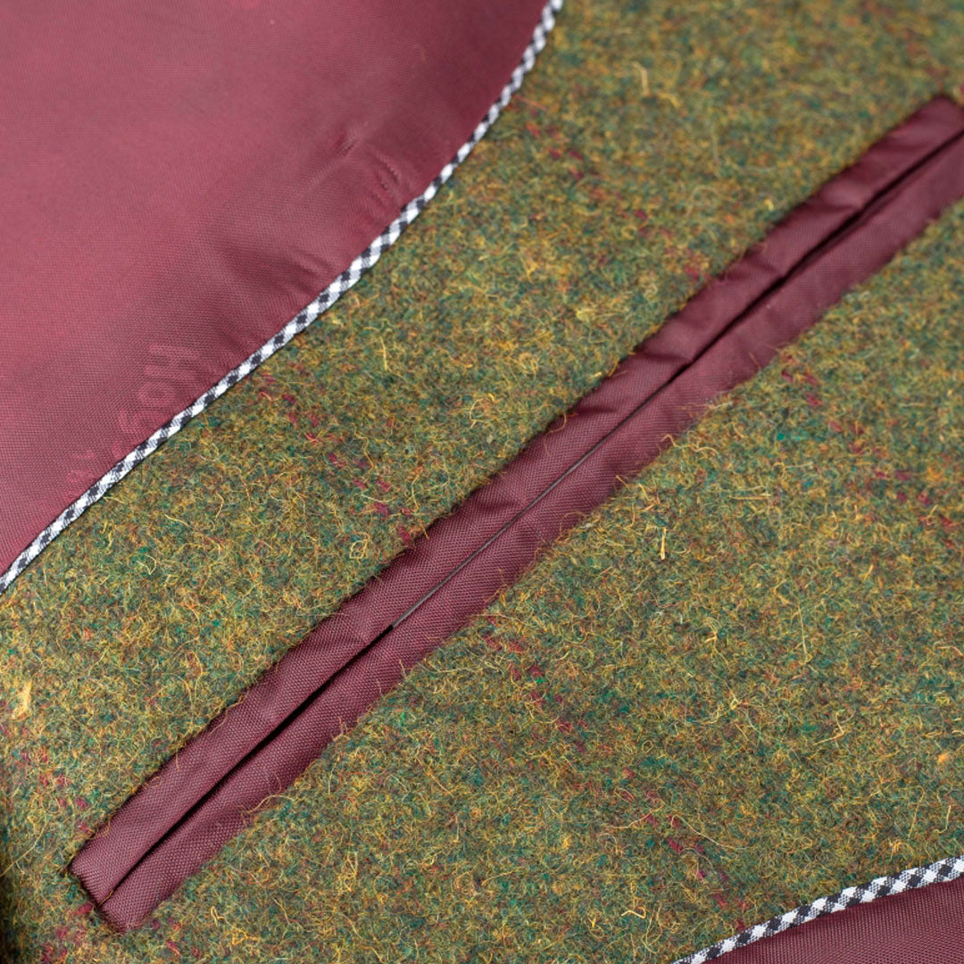 Hervorragend geschnitten mit einem klassischen Zwei-Knopf-Verschluss vorne und einer stilvollen Tickettasche. Das auffällige weinrote Statin-Futter wurde so gestaltet, dass es das dezente Karomuster ergänzt, das in die Außenschicht aus meliertem Oliven-Tweed eingewebt wurde, für einen unglaublichen Country-Look, mit dem Sie den ganzen Tag schick aussehen!