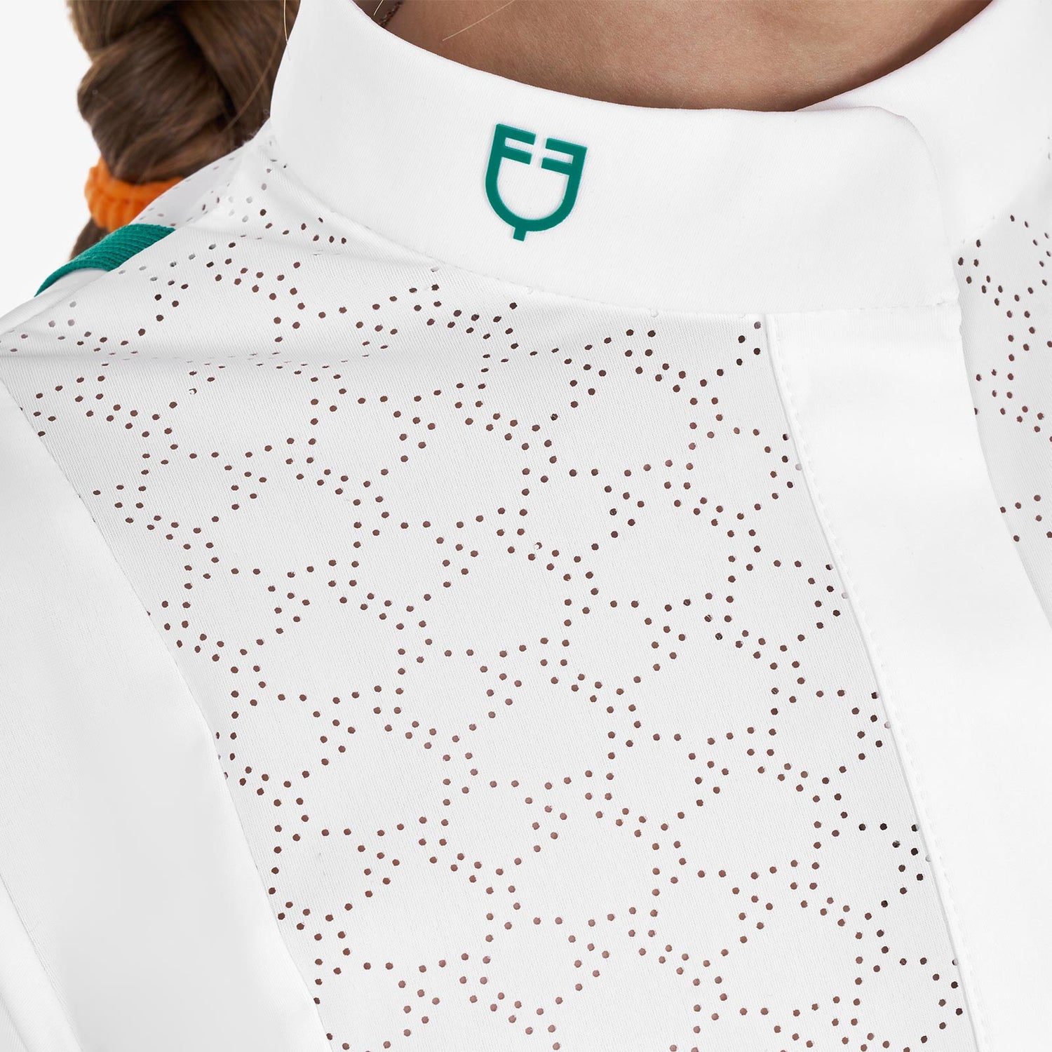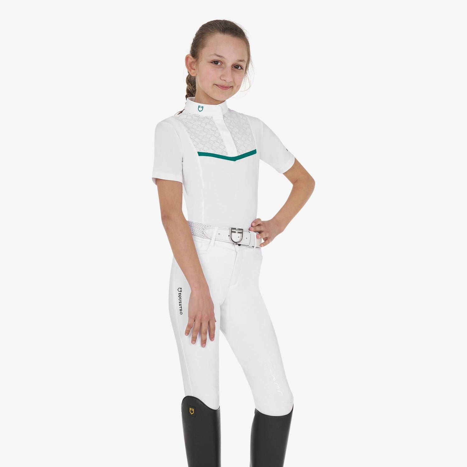 This girls' slim fit competition polo shirt combines style and performance with its innovative breathable and elastic fabric, ensuring maximum freedom of movement during summer events. The tailored cut follows the body’s natural lines without restricting comfort. Perforated inserts on the chest not only add a subtle diamond pattern but also enhance ventilation, promoting quick sweat evaporation in key areas. Designed for both comfort and elegance, this high-quality polo is perfect for competition days and beyond.