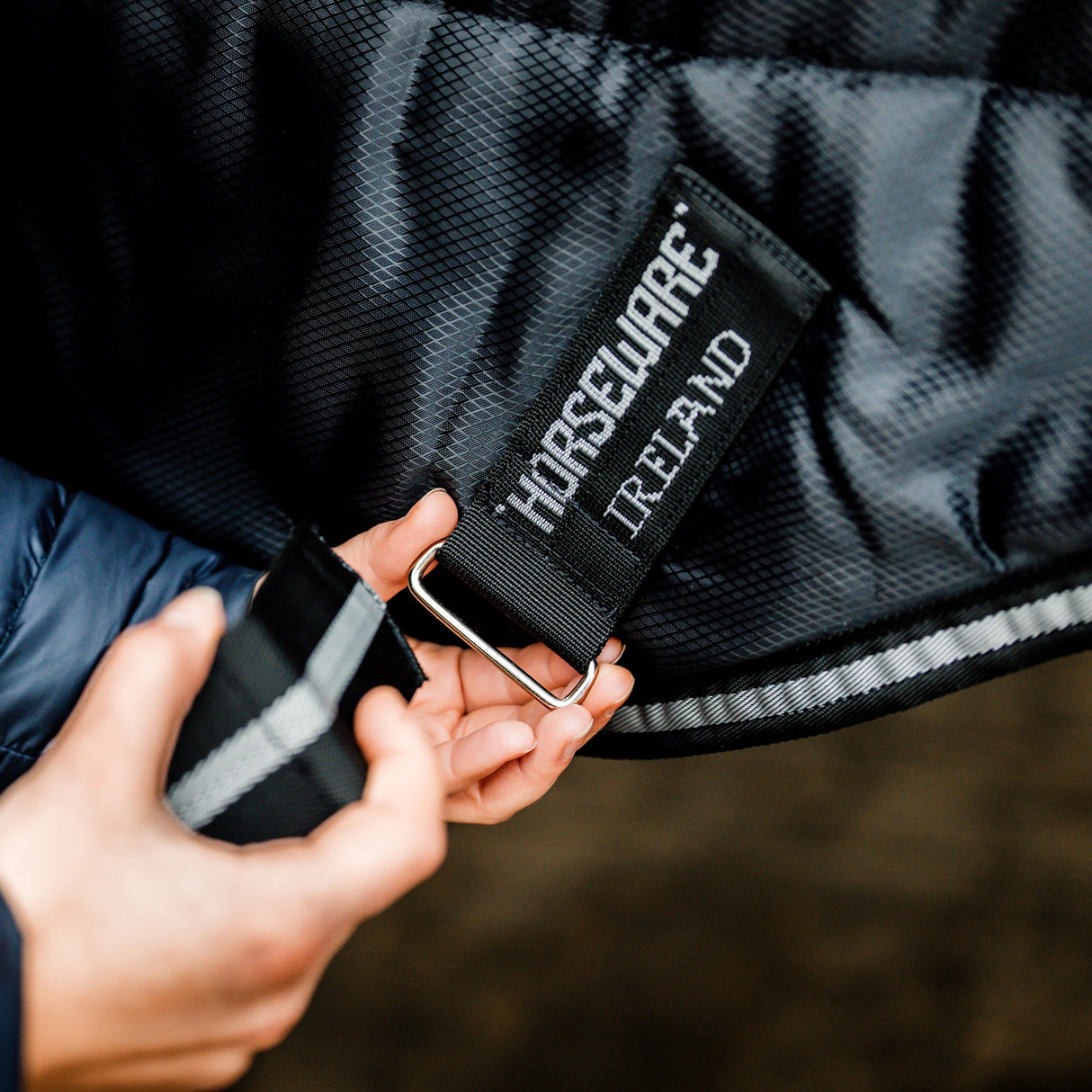 This rug features a durable, water-repellent, and stain-resistant outer fabric paired with fibrefill insulation. The Velcro liner tab attachments on the outside of the rug, along with liner loops inside, allow for seamless integration with other Horseware® liners or turnouts. Hood loops provide additional protection, while the two removable cross surcingles and straight front closure ensure a secure and comfortable fit. The front leg arches allow for greater freedom of movement, and the tail strap adds extra stability.