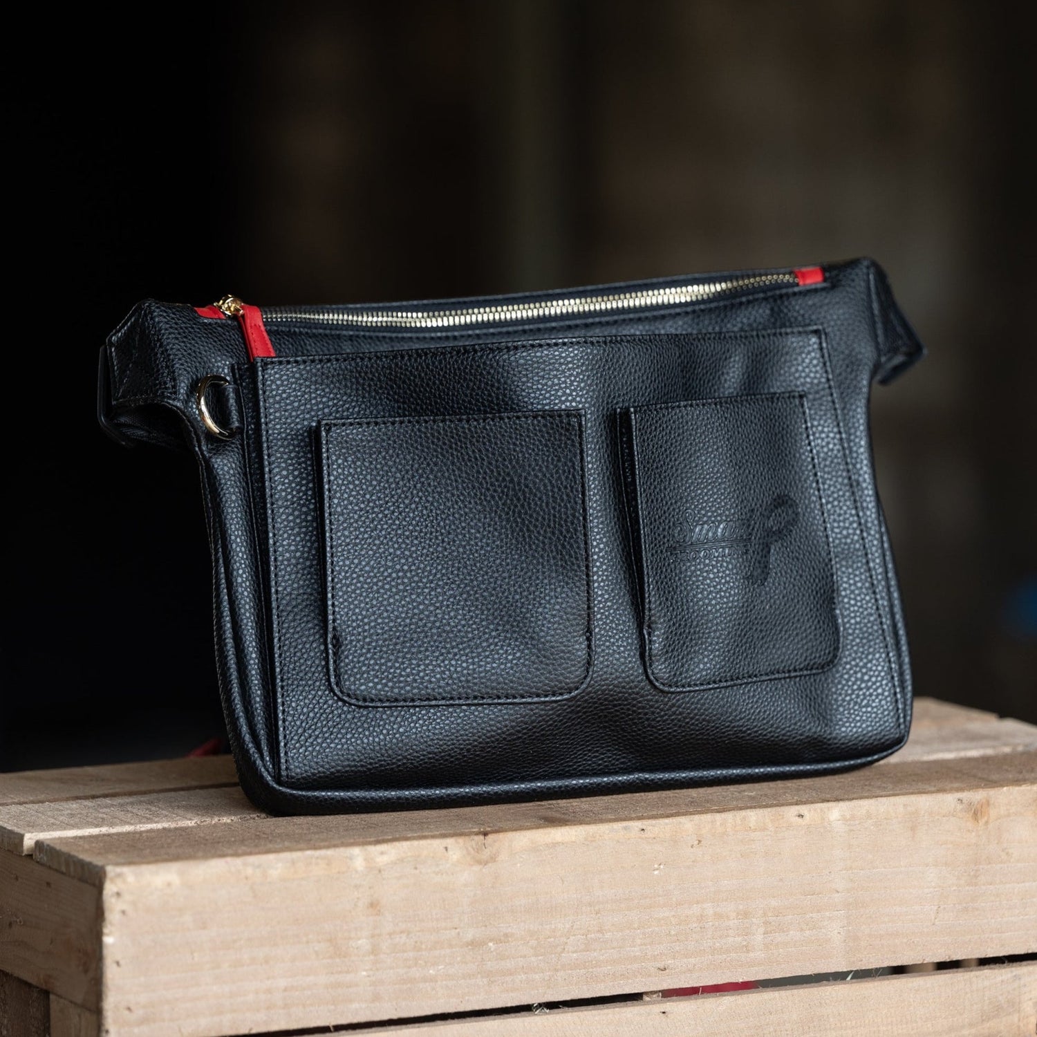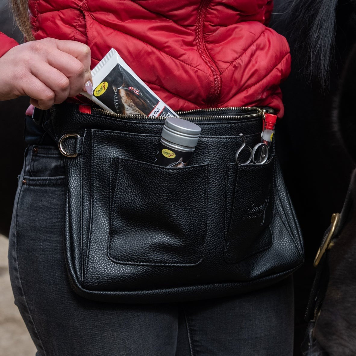 This vegan leather apron has been designed to give a place for everything needed whilst plaiting and braiding. Finished in a matt vegan leather grained material, its easy to wipe over to keep clean, whilst looking super smart for show day use.