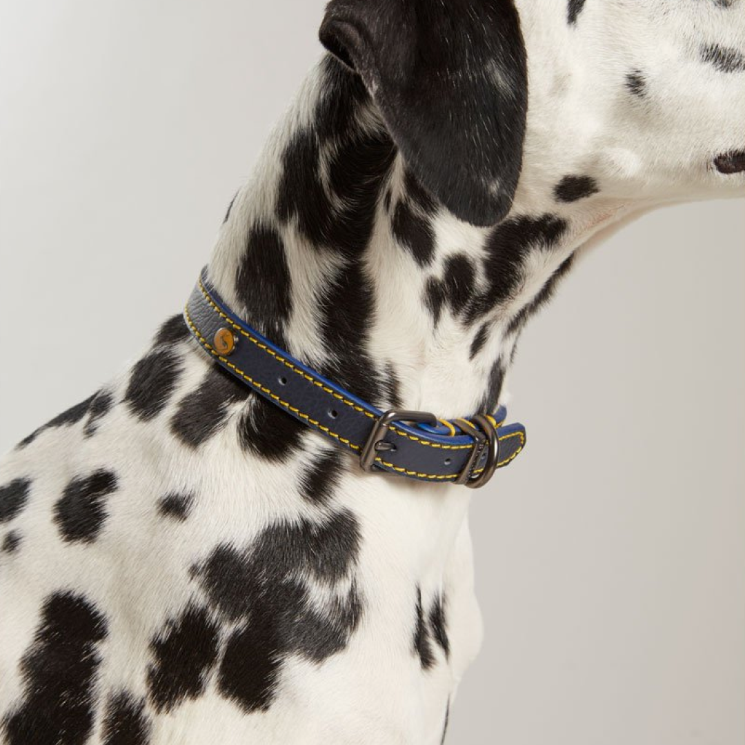 Dieses bequeme und langlebige Hundehalsband aus strapazierfähigem Leder ist in vier Größen mit passender Leine erhältlich und mit dekorativen Joules-Verzierungen versehen.