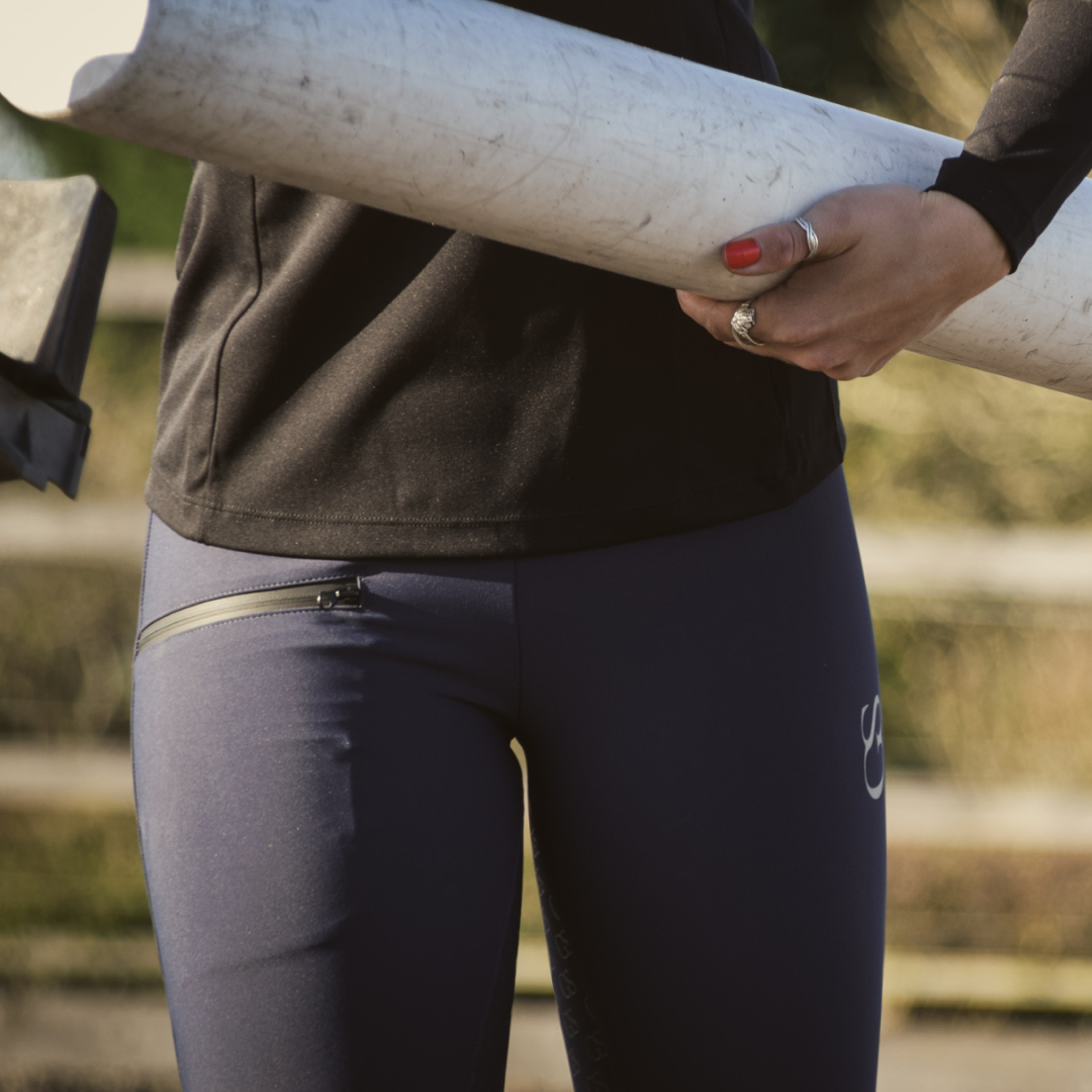 Mit einer großen Reißverschlusstasche am rechten Bein ist diese Reithose praktisch und ermöglicht die Aufbewahrung Ihres Telefons und anderer notwendiger Gegenstände, ohne dass das Material heruntergezogen oder gedehnt wird. Darüber hinaus sorgt der Reißverschluss beim Fahren für die Gewissheit, dass Ihre Besitztümer sicher sind. Der Reißverschluss wurde so gestaltet, dass er nicht nur eine praktische Funktion, sondern ein auffälliges Merkmal darstellt. Er erscheint bei allen Farbvarianten dieser Reittight in Schwarz.