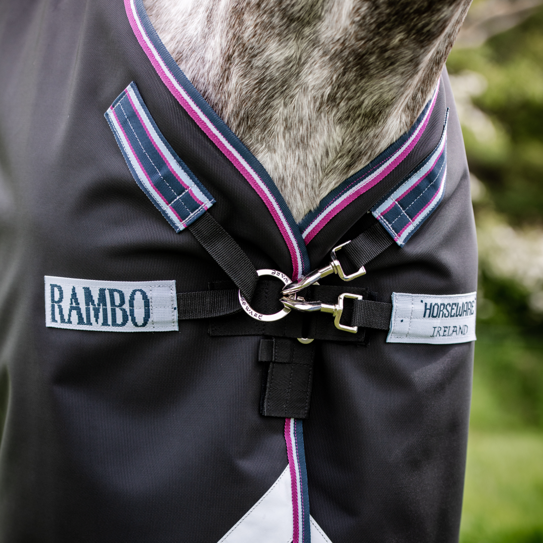 Der Rambo Supreme mit Vari-Layer ist aufgrund seiner hervorragenden Wärmespeicherung und seines maximalen Komforts eine der meistverkauften Decken von Horseware. Diese Decke besteht aus dem stärksten und langlebigsten Outdoor-Material auf dem Markt – Ballistic Nylon – und ist wasserdicht und äußerst atmungsaktiv. Zu den Merkmalen dieser Decke gehören Surefit-Halsdesign, V-Front-Verschluss, Beinbögen, reflektierende Streifen, abwischbare Schweifkordel, Futterschlaufen, drei sichere Kreuzbegurtung, glanzverstärkendes Polyesterfutter und abnehmbare Kapuze im Lieferumfang enthalten.