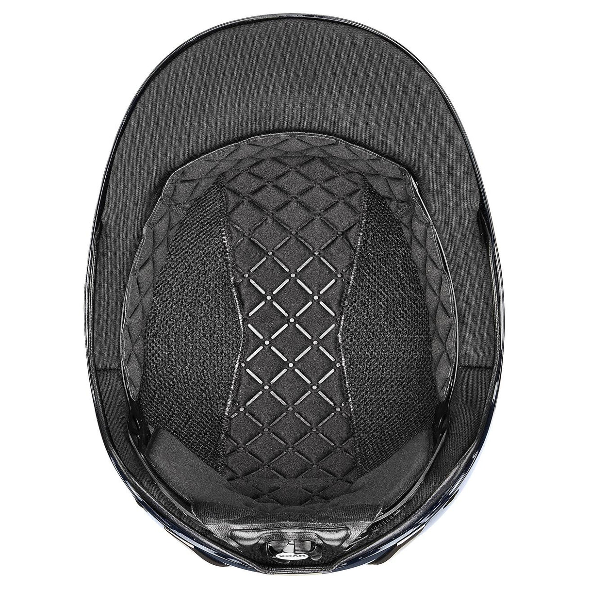 The Uvex Exxeed Glow riding helmet combines dazzling style with top-tier safety. Its glossy piano lacquer finish, satin top, and over 450 Swarovski® crystals create a striking look, framed by sleek chrome accents. Inside, a tough plastic shell and lightweight EPS core provide reliable impact protection. The 3D IAS system and Ring Fast Adapting System with premium leather straps ensure a secure, comfortable fit tailored to you. Wide vents keep you cool, while the monomatic comfort buckle offers easy, one-handed operation. Ride confidently with a helmet that shines inside and out.