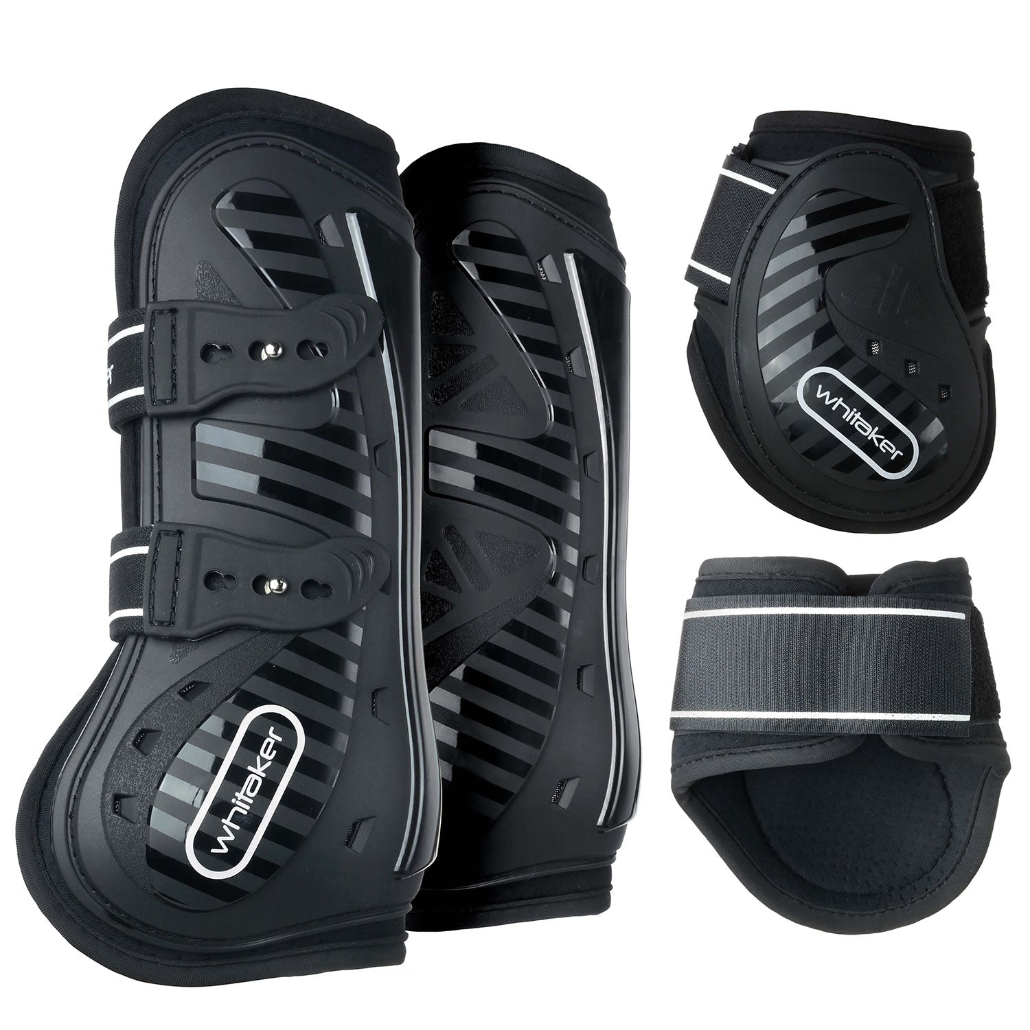 Competition approved, this strong and durable set features a matte and gloss effect PU shell with branded white and black elastic and a neoprene lining for shock absorption. Tendon boots are a pin closure and Fetlock are velcro. With a fully adjustable belt closure system with elastics, PU pads with neoprene inner lining and a Whitaker logo. The set contains two tendon boots and two fetlock boots.