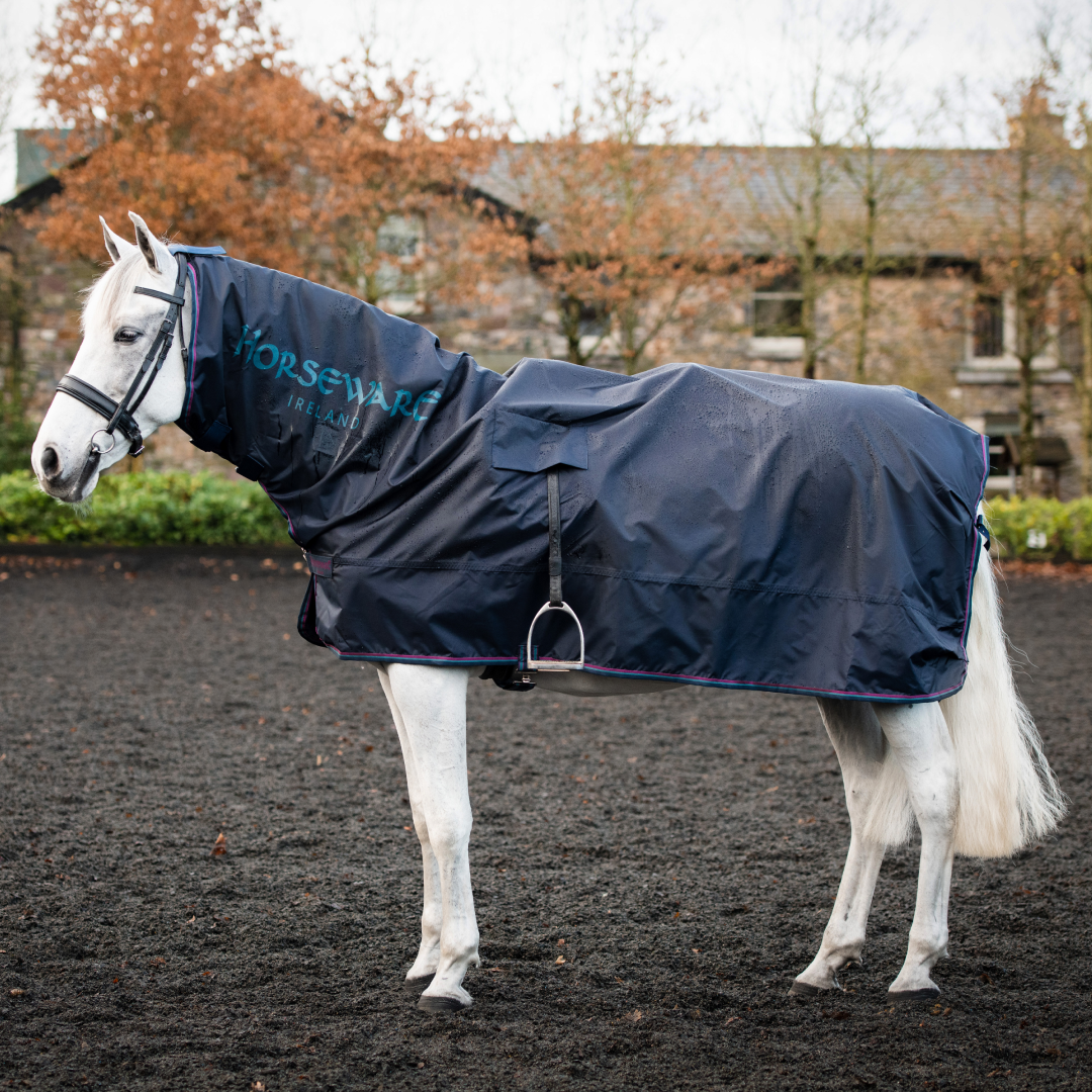 - Une couverture légère et imperméable protège votre cheval et votre harnachement des éléments. Il est doté d'un couvre-cou intégré, de fentes pour les étriers et d'une sangle ventrale, idéal pour une utilisation les jours de spectacle pluvieux. Livré avec un sac de rangement pratique.