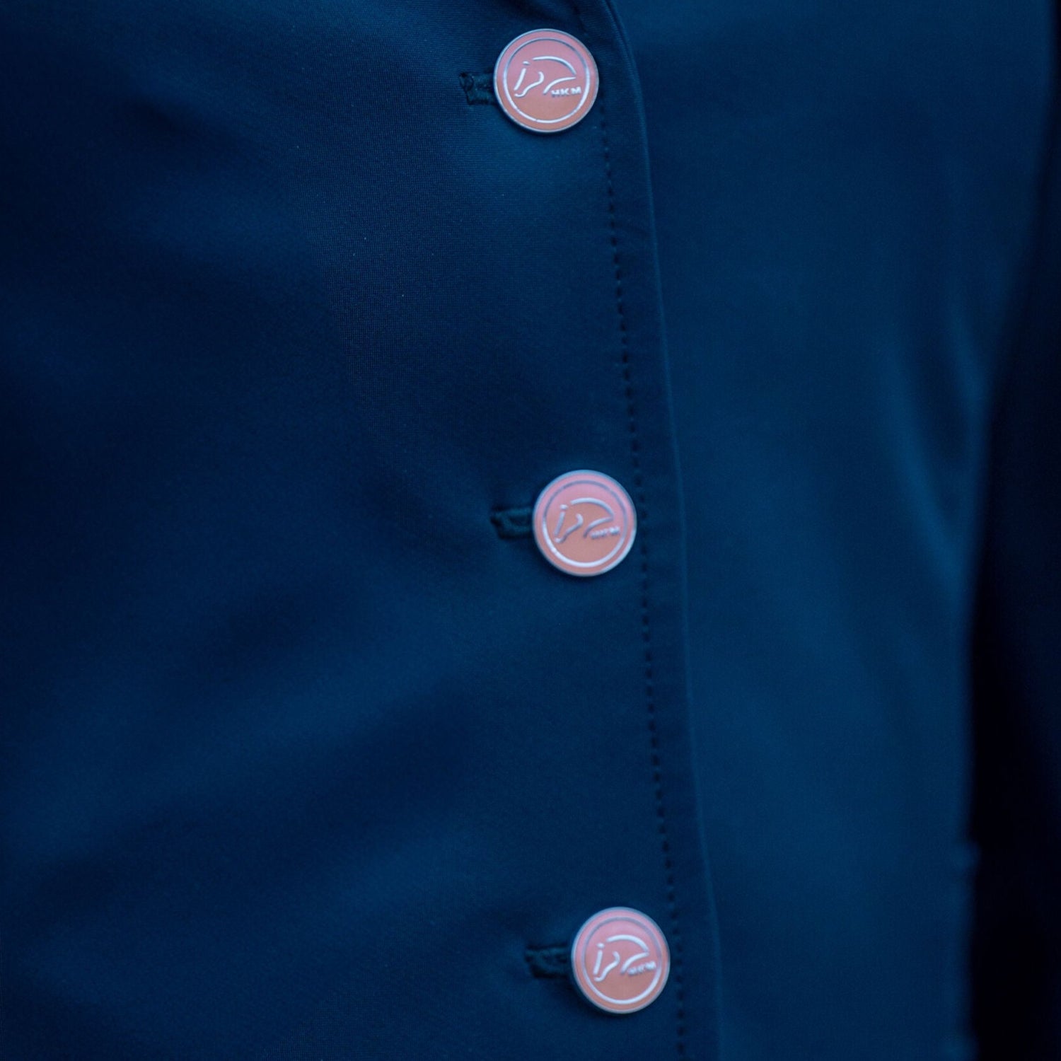 The HKM Eloise competition jacket ensures a beautiful silhouette with its tailored cut and integrated peplum at the back. It closes with a zip that is covered by an elegant button placket. Fine decorative seams, which, like the buttons, are made of elegant rose gold, give the jacket a touch of glamor. Because the jacket is both dirt-repellent and wrinkle-resistant, care for the garment is kept to a minimum.