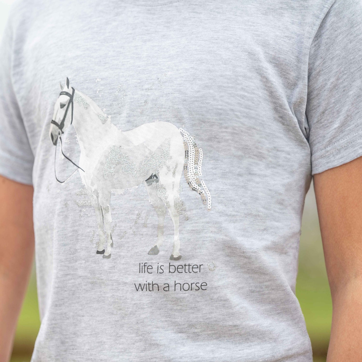The T-shirt Sparkle is the perfect top for little horse fans! Made from 100% skin-friendly cotton, it is comfortable to wear and breathable - ideal for warm days in the stable or on the playground. The highlight of the shirt is the beautiful horse motif print, which is embellished with a sparkling glitter print and lovely sequin embroidery. This will turn any outfit into a real eye-catcher! Whether riding or in their free time - with the Sparkle T-shirt, children can express their love of horses in style.