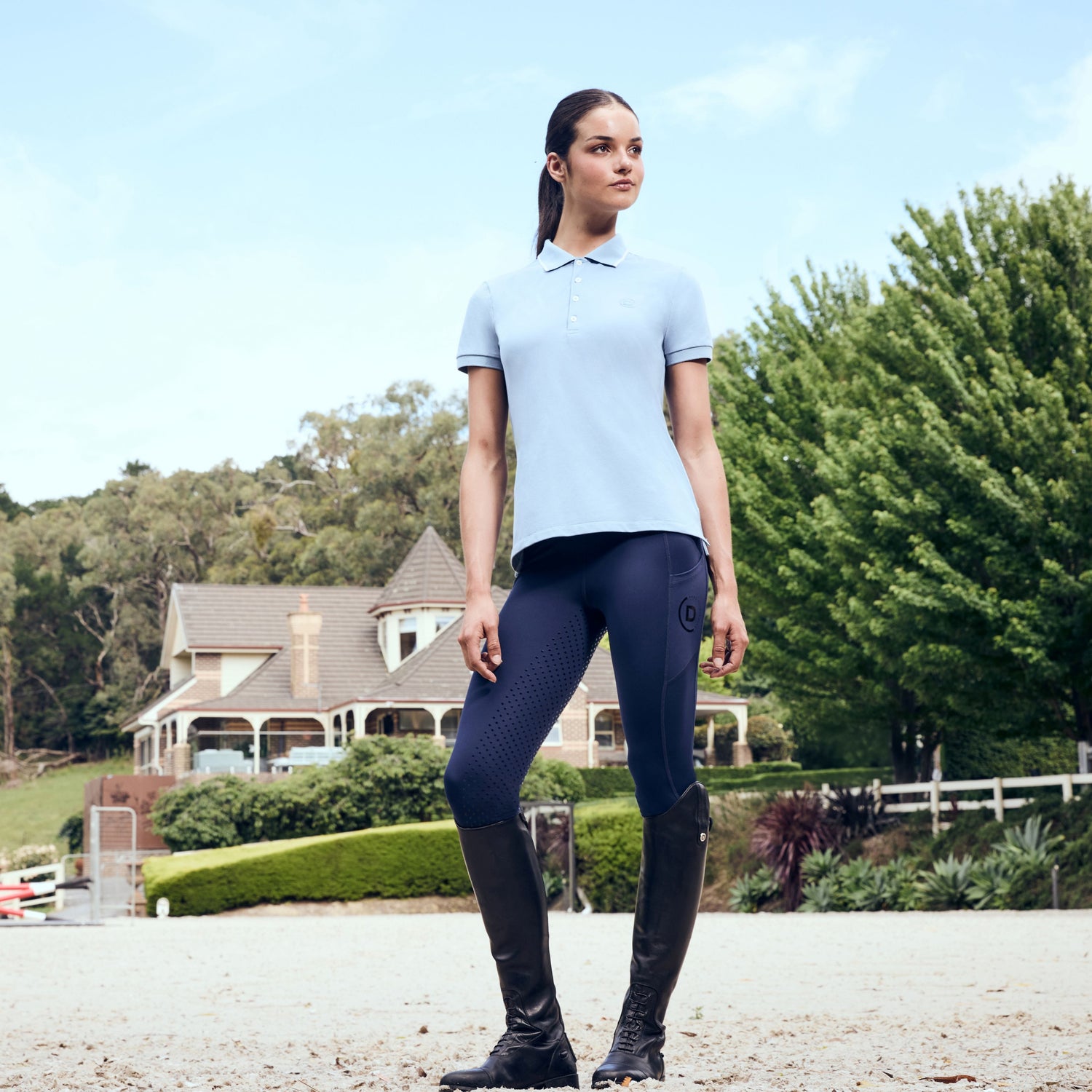 Stay cool while riding in style in the Dublin Cotton Pique Short Sleeve Polo. This classic stretch cotton polo is naturally breathable, allowing moisture to be drawn away from the body keeping you cool and comfortable all day long. The flat knit jacquard rib collar can be worn up or down for style as well as protecting your neck on sunny days. Fitted short sleeves offer a sleek fit and paired with the ribbed cuffs and button placket complete the sporty look. Subtle self-coloured Dublin 'D' branding on the front left chest keeps this polo smart and simple.