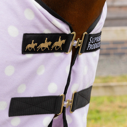 This smart and versatile soft fleece rug in eye catching polka dot print is an ideal choice for all horse owners. It makes a fabulous show rug and is perfect for travelling in especially when teamed with the rest of the Supreme Products Dotty Fleece Collection you will be the envy of the showground in this winning matchy matchy look! It is also a great stable fleece to keep horses clean after bathing and the night before a competition. Made with high quality luxury fleece in a classic cut design it features a soft fleece wither area twin front closures two adjustable surcingle’s and a filet string keeping it firmly in place offering a comfortable fit.