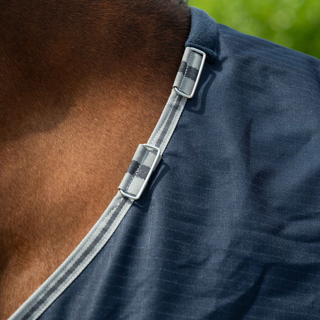 The HKM Turnout Rug with Detachable Neck -Therma Pro- is a high-quality choice for your horse. Its waterproof and breathable design guarantees 3.000 ml m²/24 h of breathability and can withstand up to 3.000 mm of water. The Breathe-Comfort hi-tech fabric quickly transports moisture to the outside, keeping your horse comfortable and dry. With a flexible v-closure system and a longer back length for an optimum fit, this rug can be used as a rain rug all year round. Plus, its temperature regulation from -10°C to 20 °C makes it extremely weatherproof. However, caution should be taken with clipped or older horses, as the sensation of warmth is individual and should be checked regularly.