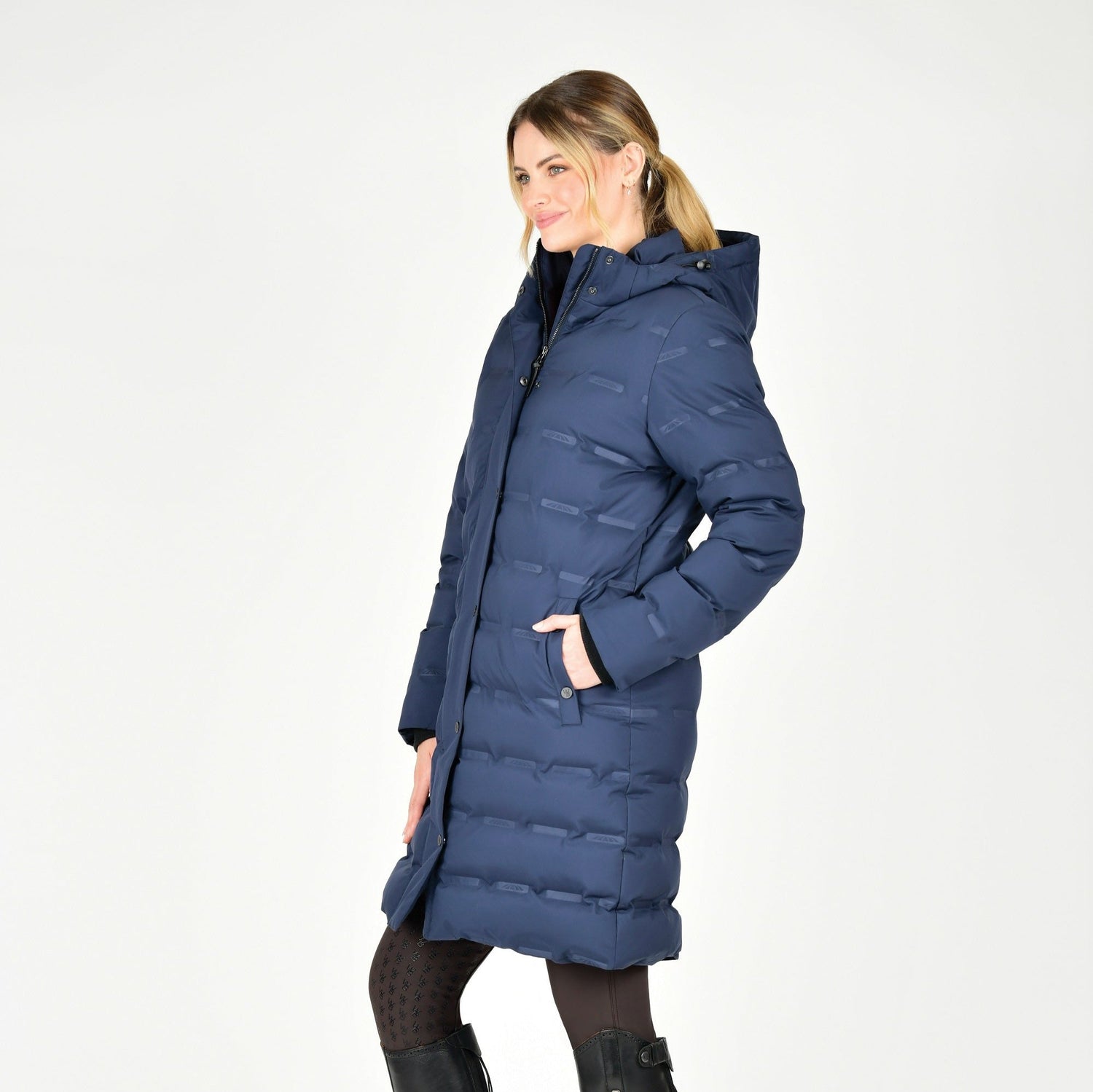 Seal in the warmth with the stylish WeatherBeeta Helsinki Heat Seal Quilted Jacket! Designed with comfort in mind this long line winter coat is sure to keep you warm at the yard this winter. The showerproof outer will protect you in the unexpected showers, whilst the heat seal quilted design remains stylish, ribbed storm cuffs and wadding fill add extra protection keeping you cosy all day long. Featuring a removable hood, with toggles and drawcord, for versatility. Two side pockets with press stud closure are ideal for keeping your hands warm when teaching! With a two way front zip closure and rear gusset with press stud closure allow for freedom of movement when walking or in the saddle. This winter coat comes in Navy and available in Ladies XS - XL.