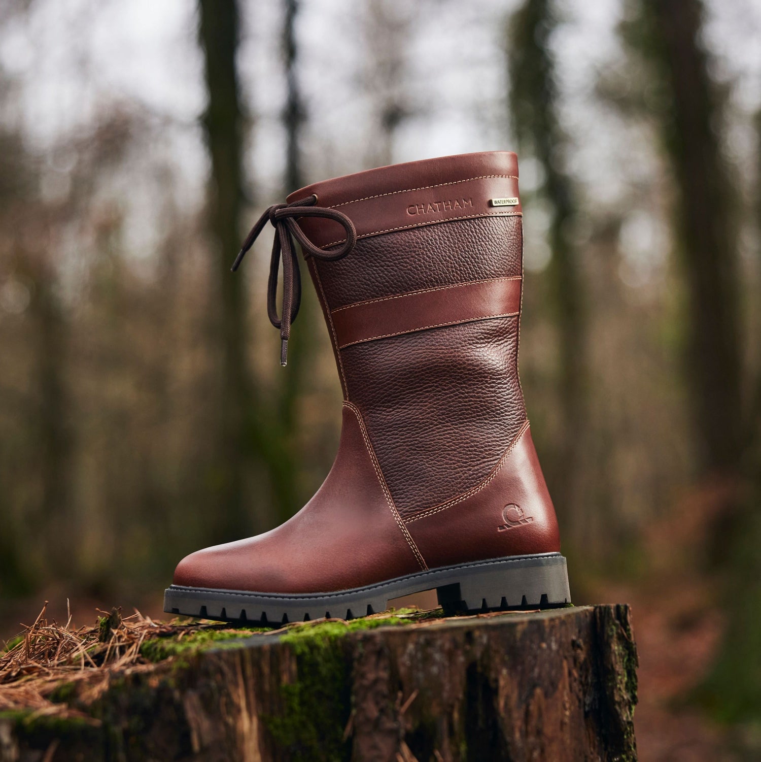 Made using a stylish blend of waterproof premium leather in smooth and grained finish, these mid-height women's boots are a pull-on style with drawstring lace detail, Chatham logo embossing and a waterproof breathable fabric lining. They have Chatham's sole spring poron performance cushioning, which is anti-bacterial and offers maximum comfort and shock absorption, and they sit on a heavy duty rubber sole.