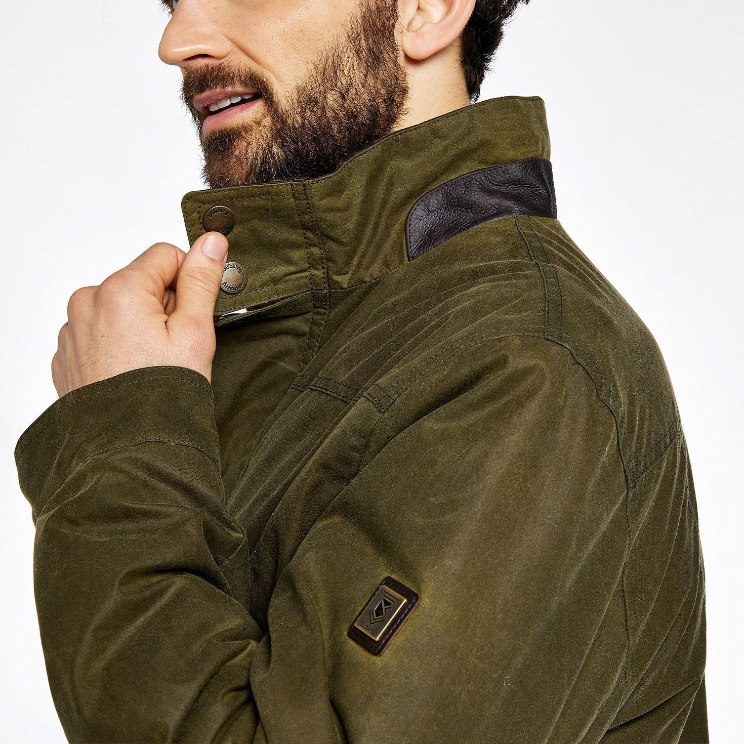 - Leather collar tab facing and sleeve placket