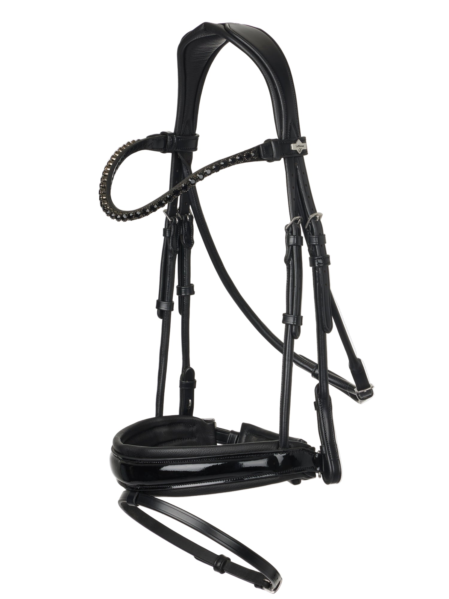 The patent crank noseband has excellent cushioning. Roller buckles on the crank strap and flash allow a precision adjustable fit for sensitive control. This is a statement piece, designed to give a subtle, Dressage-approved sophistication to your look.