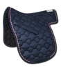 Anatomically-shaped saddle pad with floral quilting and decorative cord. The underside is in sweat-absorbent and breathable material. 300 g/m² padding and 8mm foam ensure outstanding pressure distribution and shock absorption. Loops for girth and saddle with practical velcro fastenings.