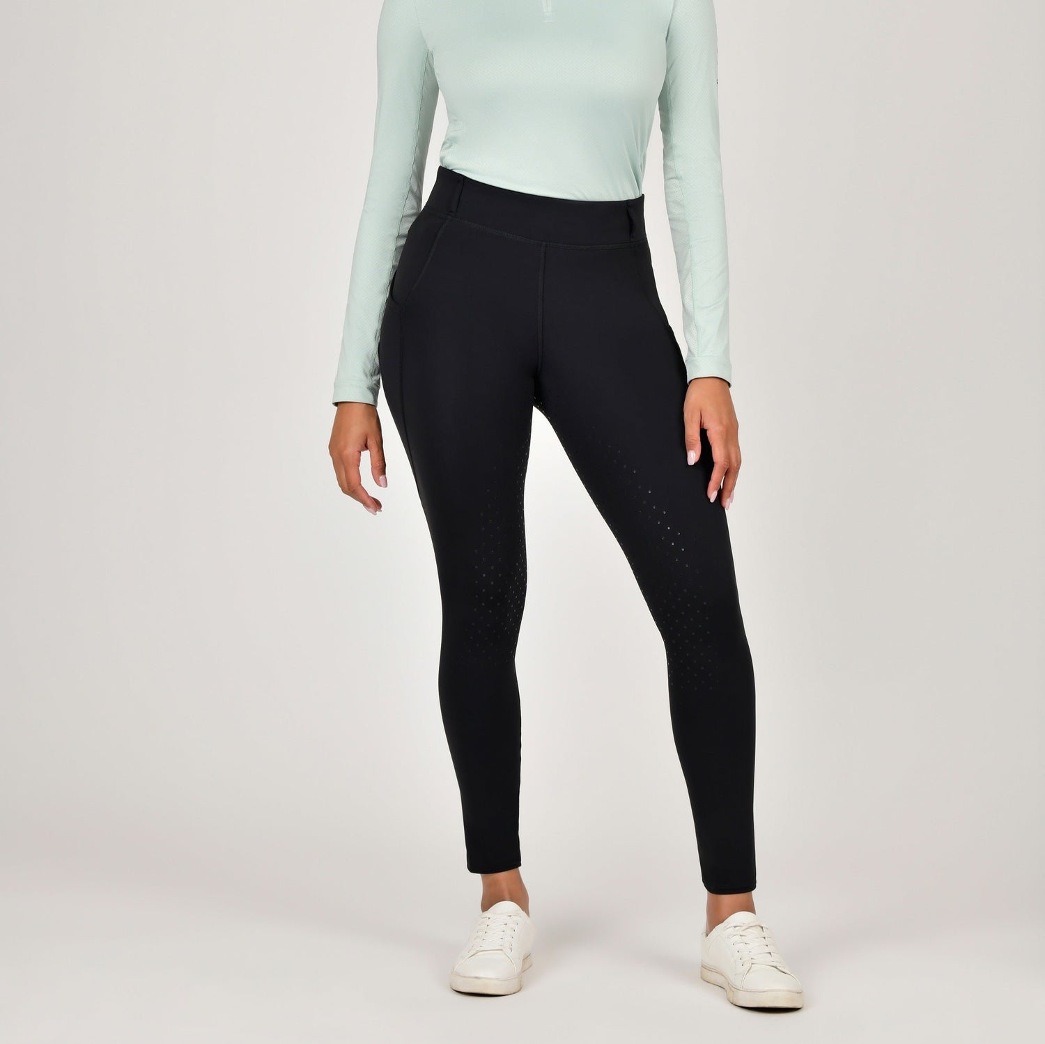 The Dublin Thermal Riding Tights are an ideal choice this winter to keep you warm whilst horse riding. These pull on style riding tights are made from a four way stretch thermal fabric with brushed back and Comfort Dry Technology is breathable and supports moisture control and designed for comfort and warmth during everyday activities. The mid rise wide waistband offers support for a flattering and comfortable fit featuring belt loops for the option of wearing with a belt! Featuring a pocket on each side with a gel grip ideal for phone storage whilst exercising, whilst the dot print full grip gel seat provides additional stability when in the saddle. Comes in Black, Childs, Adults and curve sizes available.